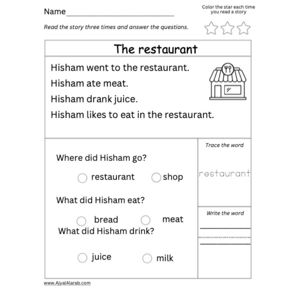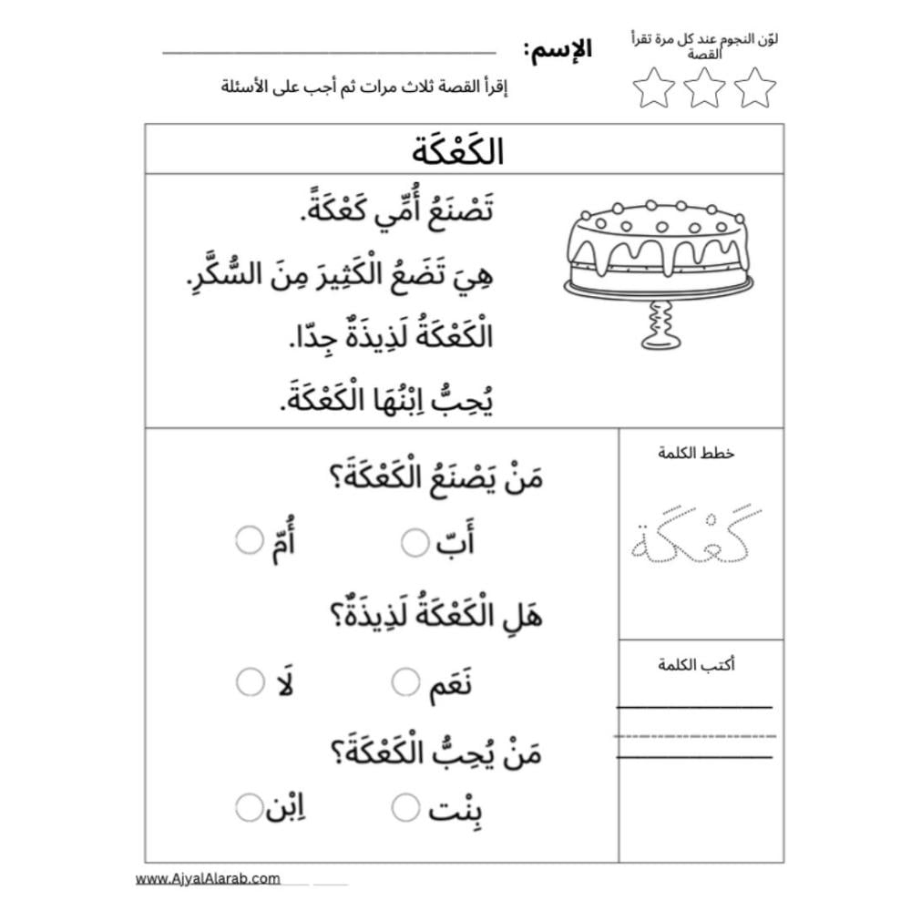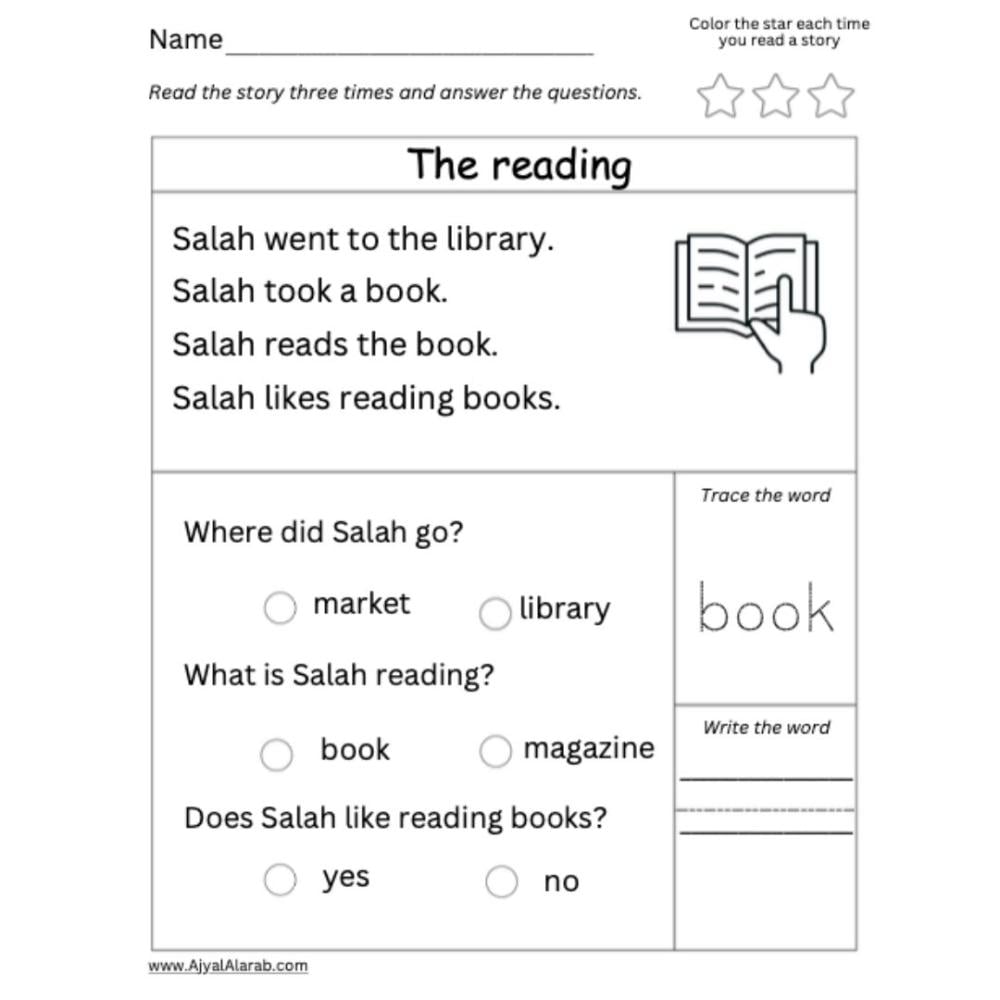 يقرأ الطفل كل قصة 3 مرات ويُلوّن النجوم بعد كل قراءة، مما يعزز الطلاقة والتمرّس.