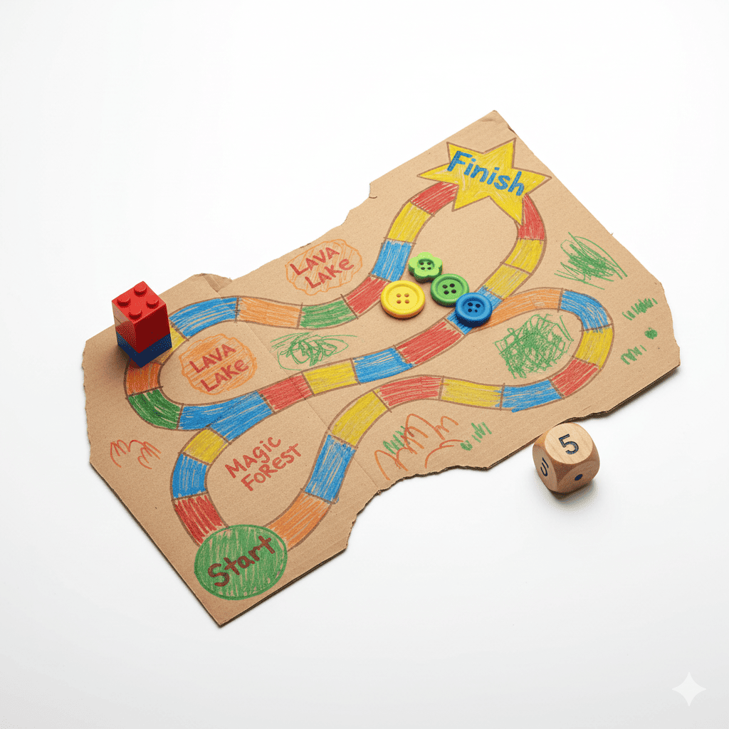 - استخدموا أزراراً ملونة أو قطعاً من الليجو كبيادق للعب، واستخدموا حجر نرد من لعبة قديمة.