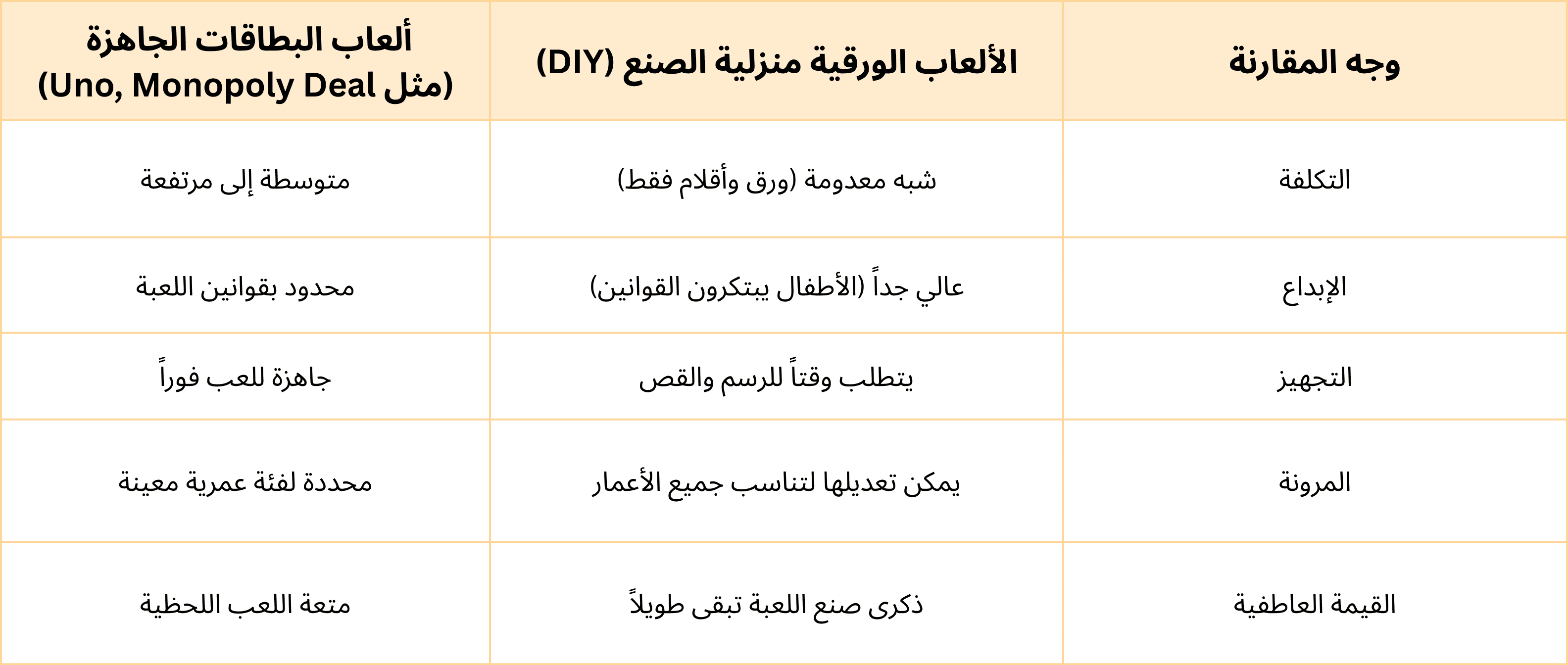 جدول مقارنة: ألعاب ورقية جاهزة vs ألعاب ورقية منزلية الصنع