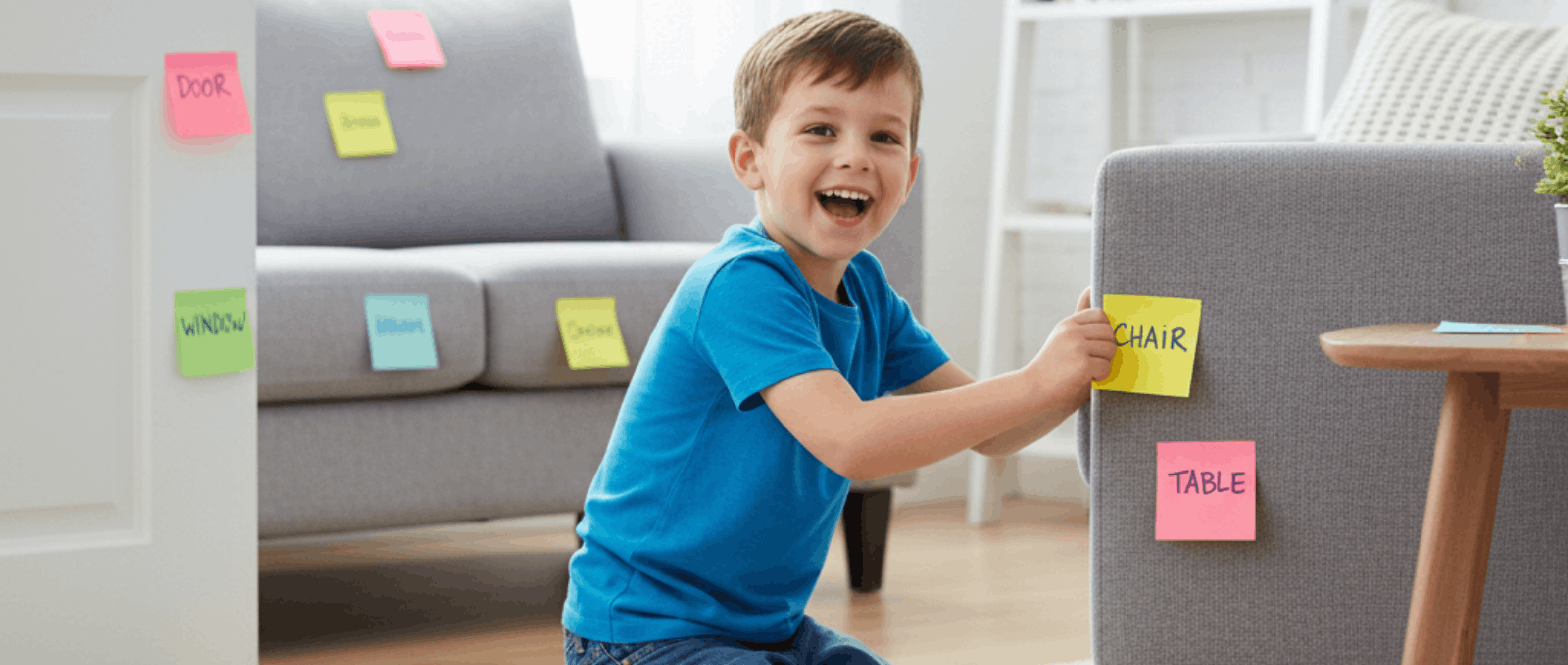 - اكتبي أسماء الأشياء في المنزل على بطاقات لاصقة (باب، شباك، كرسي / Door, Window, Chair). اطلبي من طفلك لصق كل كلمة على الشيء المناسب لها. هذا يربط الكلمة المكتوبة بالشيء المحسوس.
