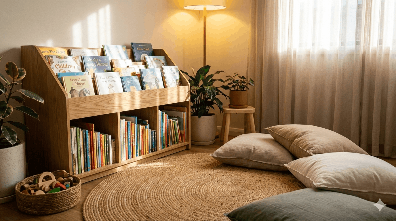 - ركن القراءة: خصصي زاوية صغيرة بها وسائد مريحة، وإضاءة جيدة، ورف منخفض يسهل على الطفل الوصول إليه.