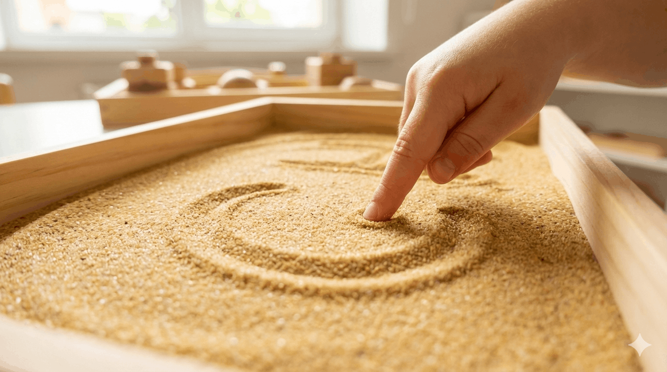 - الحروف الرملية: اصنعي بطاقات عليها حروف بارزة (باستخدام ورق الصنفرة أو الغراء والرمل). اطلبي من طفلك تتبع شكل الحرف بأصبعه وهو ينطق صوته. هذا يربط الشكل بالصوت وبالحركة.