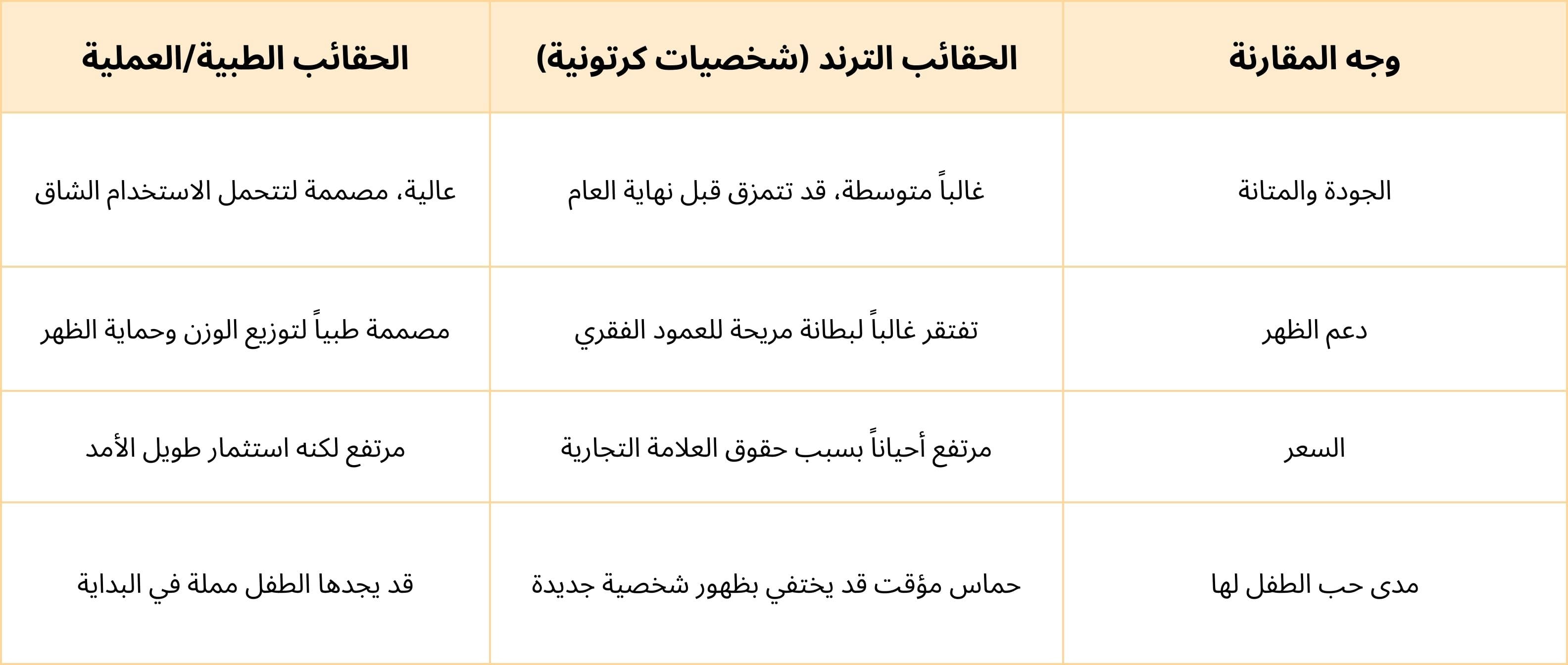 إليك جدول مقارنة بسيط يساعدك في اتخاذ القرار عند شراء الحقيبة المدرسية: